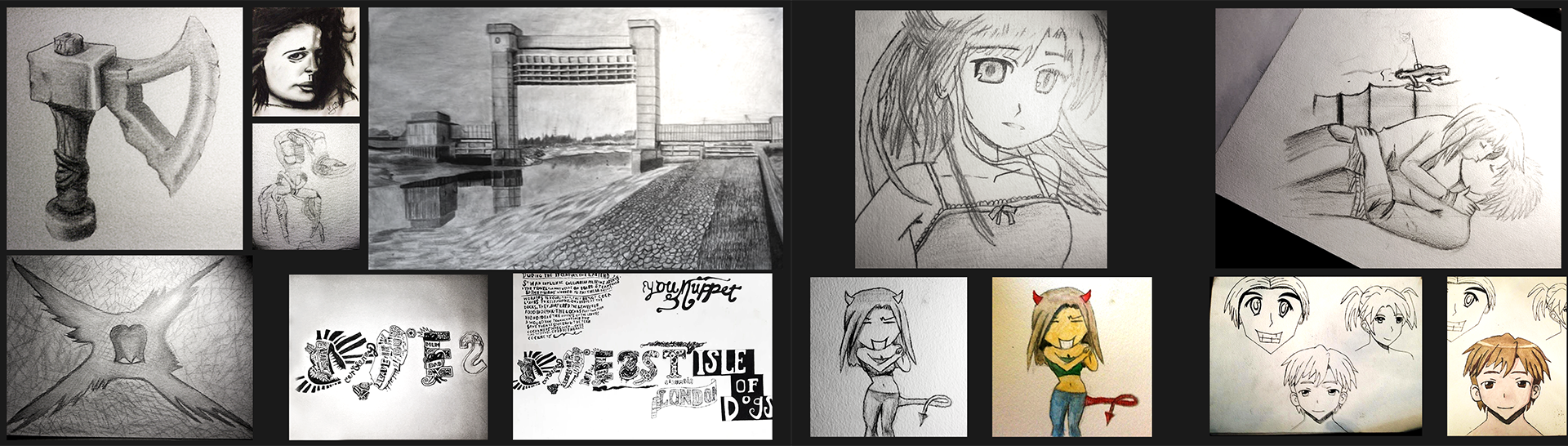 In the above image is a selection of drawings inspired by these artists as well as a few that were made solely by me during my fine art course in Sixth Form. There is also a Scrab, the very first drawing I ever made that I was proud of as I was inspired by the game Oddworld: Abe's Oddysee.